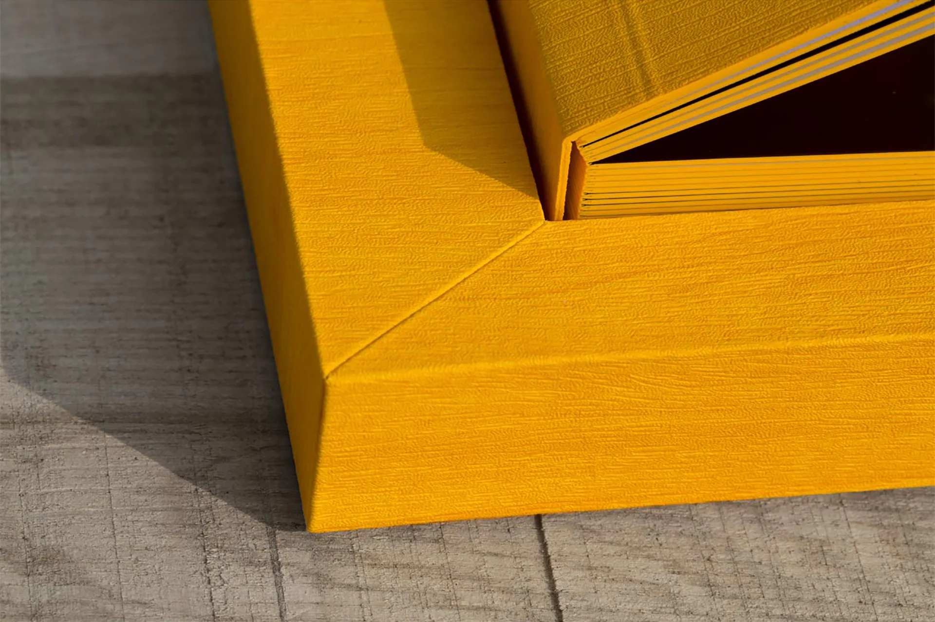 Young Book represents going beyond of a formal and yet unsurpassed limit, where the book was obtained through the creation of thick covers, with a round spines. Today curves disappear, covers get thinner making way to the essential shapes of the box and book for a minimal and simple result which denotes a strong avant-garde taste.